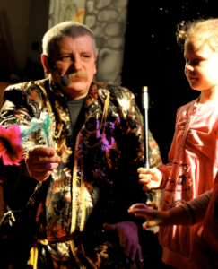 Dzieci podczas spektaklu aktywnie uczestniczą oraz uczą się prostych sztuczek.